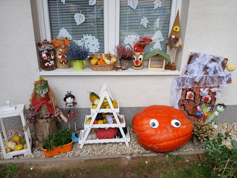 Hravú atmosféru na našom školskom dvore vytvára jesenná výzdoba plná tekvíc, gaštanov a figúriek. Hlavnou hviezdou je veľká tekvica s obrovskými očami, ktoru sme so žiakmi vypestovali v školskej záhradke.