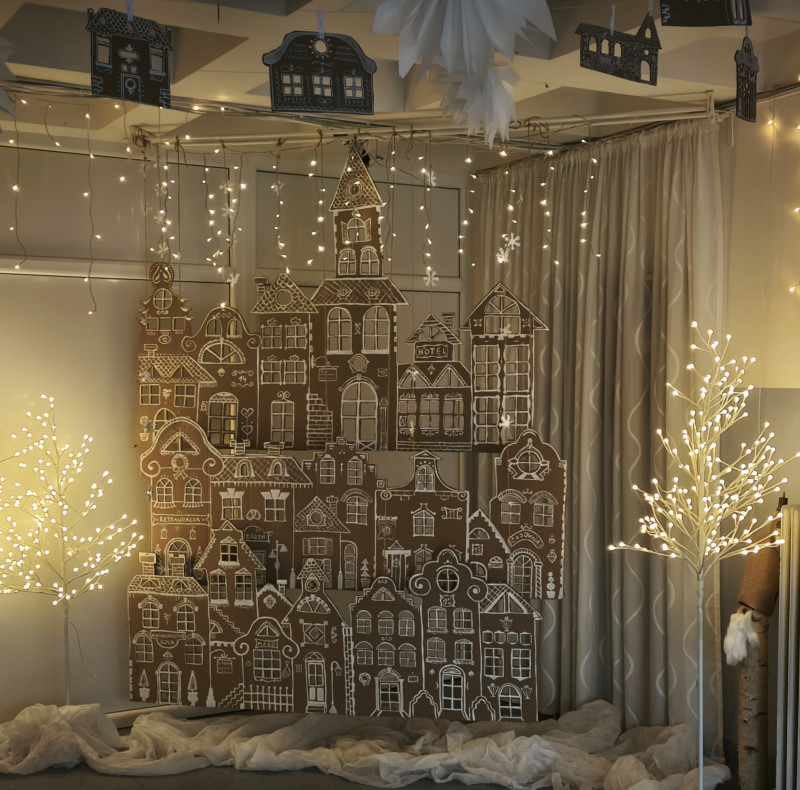 Mestečko je ručne vyrezávané a maľované na kartóne. Toto mestečko strážia vpravo dole brezoví drevení trpaslíci s čiapkami z vrecoviny, . Strop vestibuly školy zdobia kartónové domčeky s papierovými hviezdami, ktoré sú vyrobené z desiatových sáčkov.